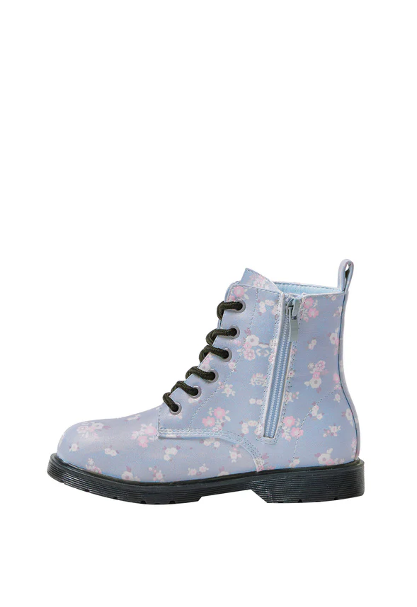 Kick off cute-meets-cool style with this lug sole boot. Complete with faux leather and a ditsy floral print. Inside zipper for easy on and off and lace up for the perfect fit.